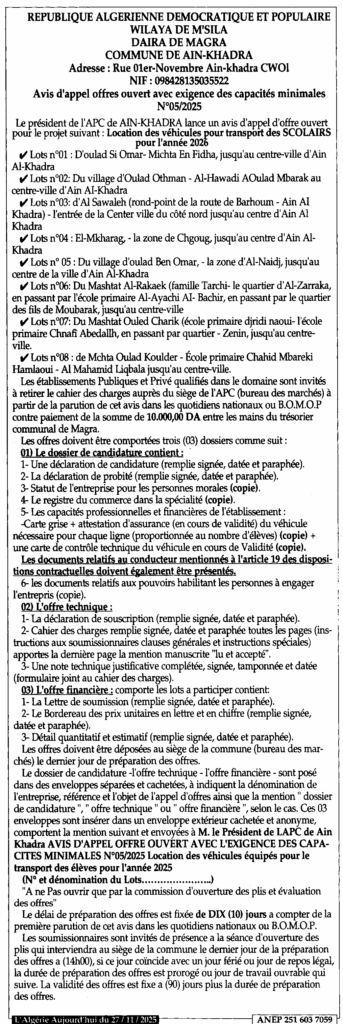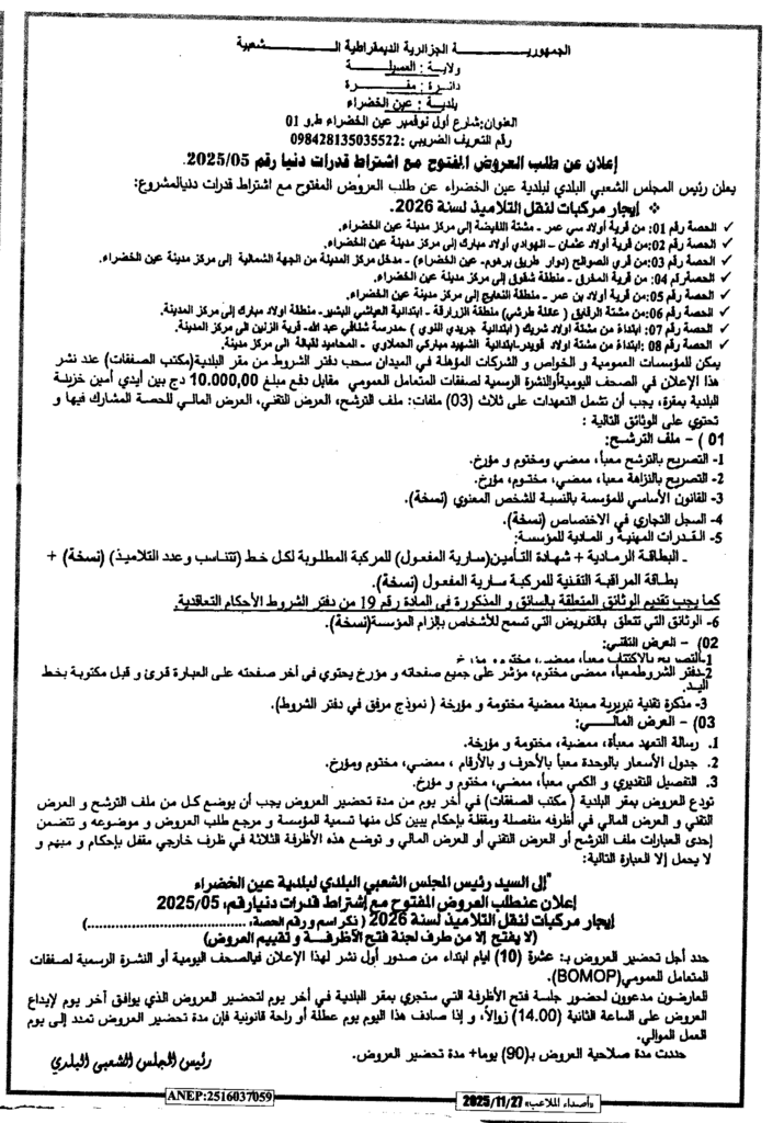 إعلان عن طلب العروض المفتوح 2025/05 بلدية عين الخضراء