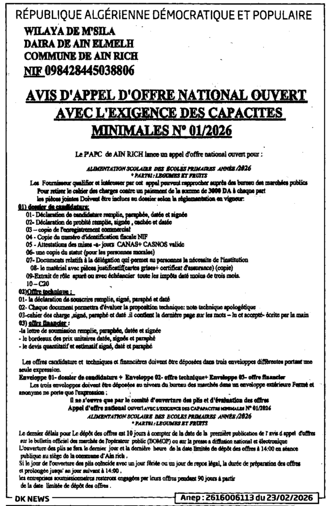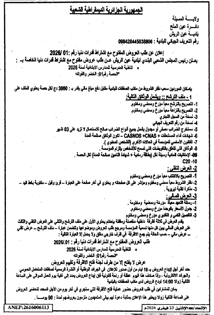 إعلان عن طلب العروض المفتوح 2026/01 بلدية عين الريش