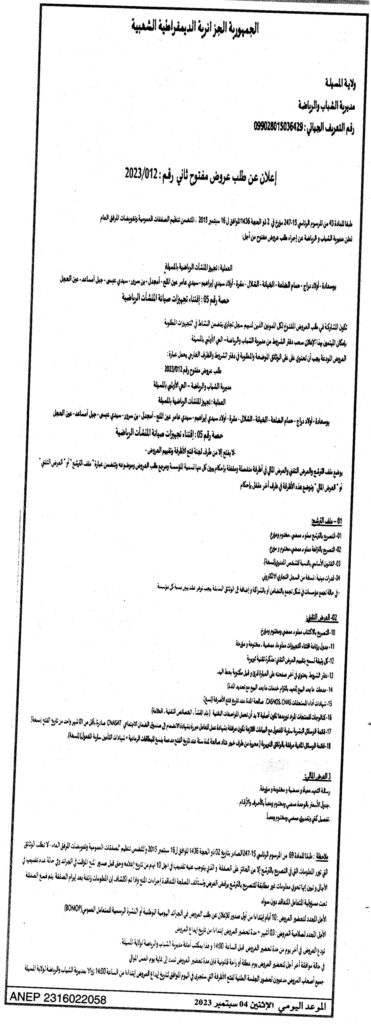 إعلان عن طلب عروض مفتوح ثاني 2023/12 مديرية الشباب والرياضة لولاية المسيلة