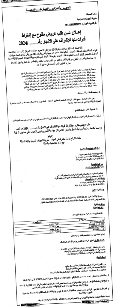 إعلان عن طلب عروض مفتوح: دراسة ملائمة ومتابعة من أجل انجاز وتجهيز 07 مراكز جوارية للتخزين البيني على مستوى الولاية/ مديرية التجهيزات العمومية لولاية المسيلة