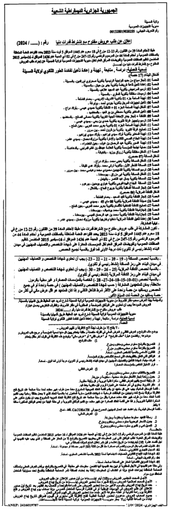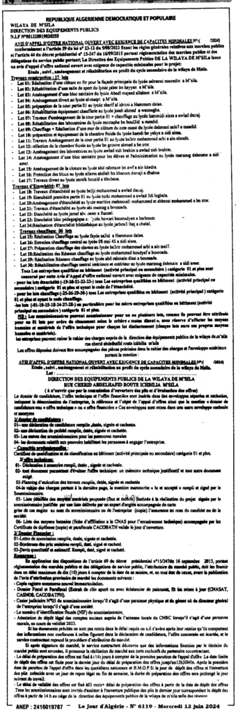 إعلان عن طلب عروض مفتوح دراسة ومتابعة وتهيئة وإعادة تأهيل لفائدة الطور الثانوي لولاية المسيلة/ مديرية التجهيزات العمومية لولاية المسيلة