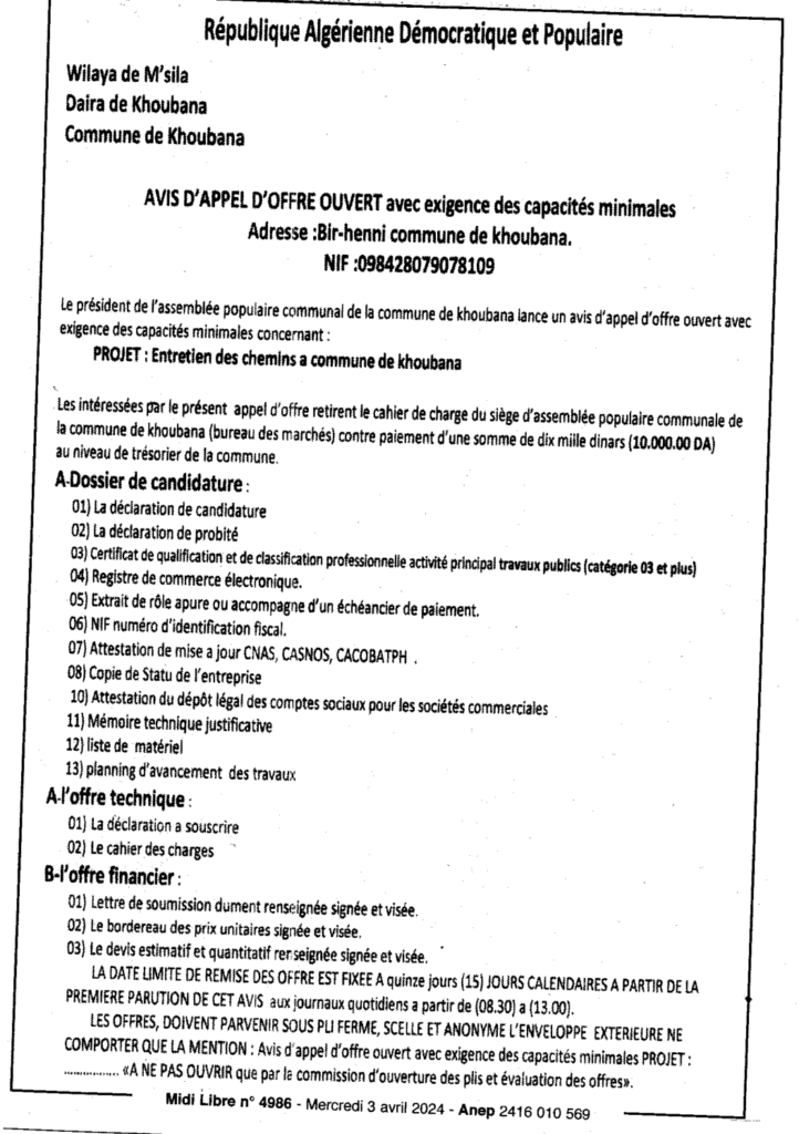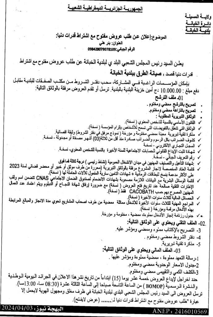 إعلان عن طلب عروض مفتوح: صيانة الطرق ببلدية الخبانة