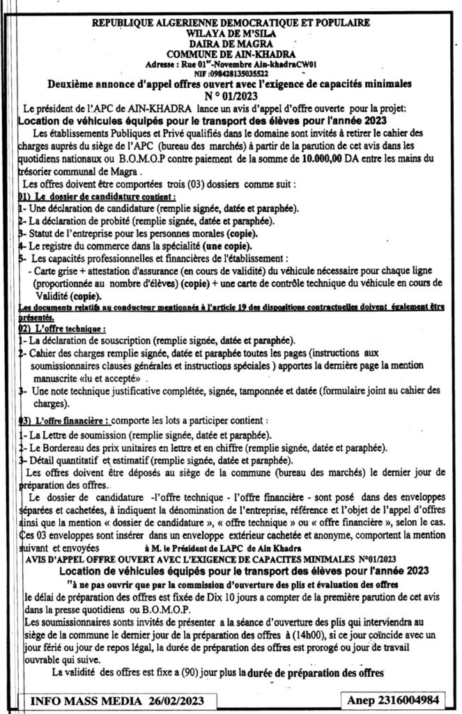 إعلان عن طلب عروض مفتوح للمرة الثانية 2023/01 بلدية عين الخضراء