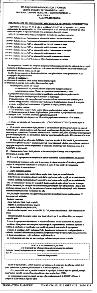 تسمية العملية: أشغال تهيئة تجزئة قطع أرضية مخصصة للبناء الذاتي27 ديسمبر، 20220 42 شاركها فيسبوك X مشاركة عبر البريد طباعة