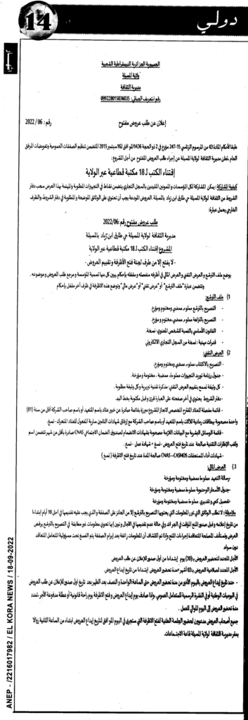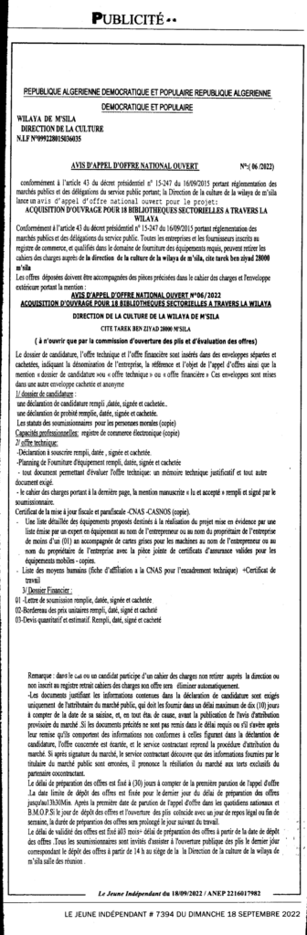 إجراء طلب عروض مفتوح من أجل المشروع: إقتناء الكتب لـ 18 مكتبة قطاعية عبر الولاية18 سبتمبر، 20220 9 شاركها فيسبوك X مشاركة عبر البريد طباعة