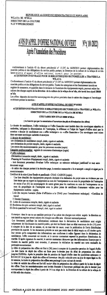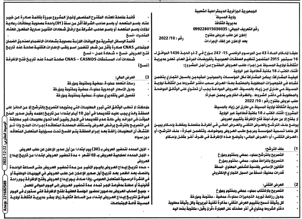 إعلان عن طلب عروض مفتوح 2022/10 بعد الإعلان عن إلغاء الإجراءات مديرية الثقافة لولاية المسيلة