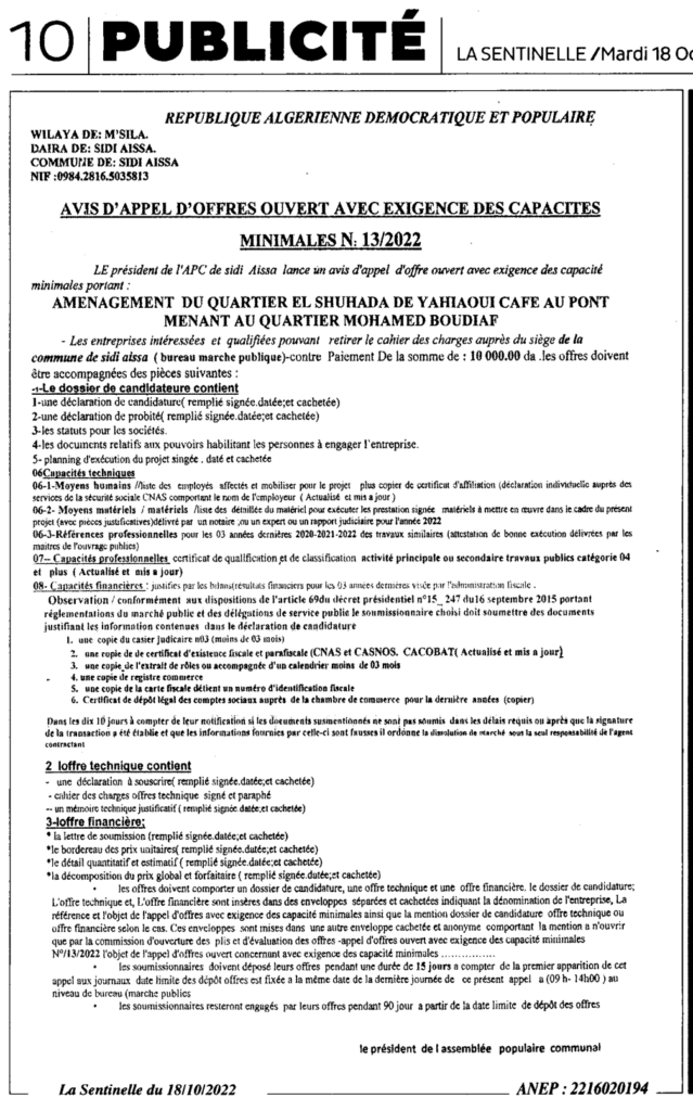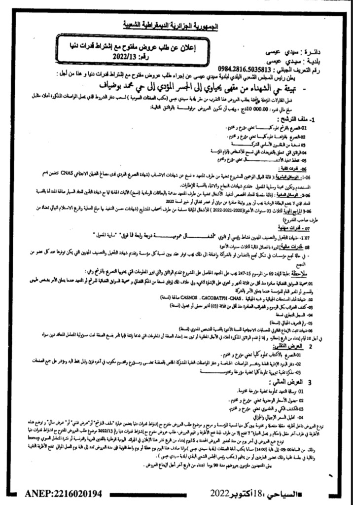 إجراء طلب عروض مفتوح مع اشتراط قدرات دنيا وهذا من أجل: تهيئة حي الشهداء من مقهى يحياوي إلى الجسر المؤدي إلى حي محمد بوضياف18 أكتوبر، 20220 15 شاركها فيسبوك X مشاركة عبر البريد طباعة
