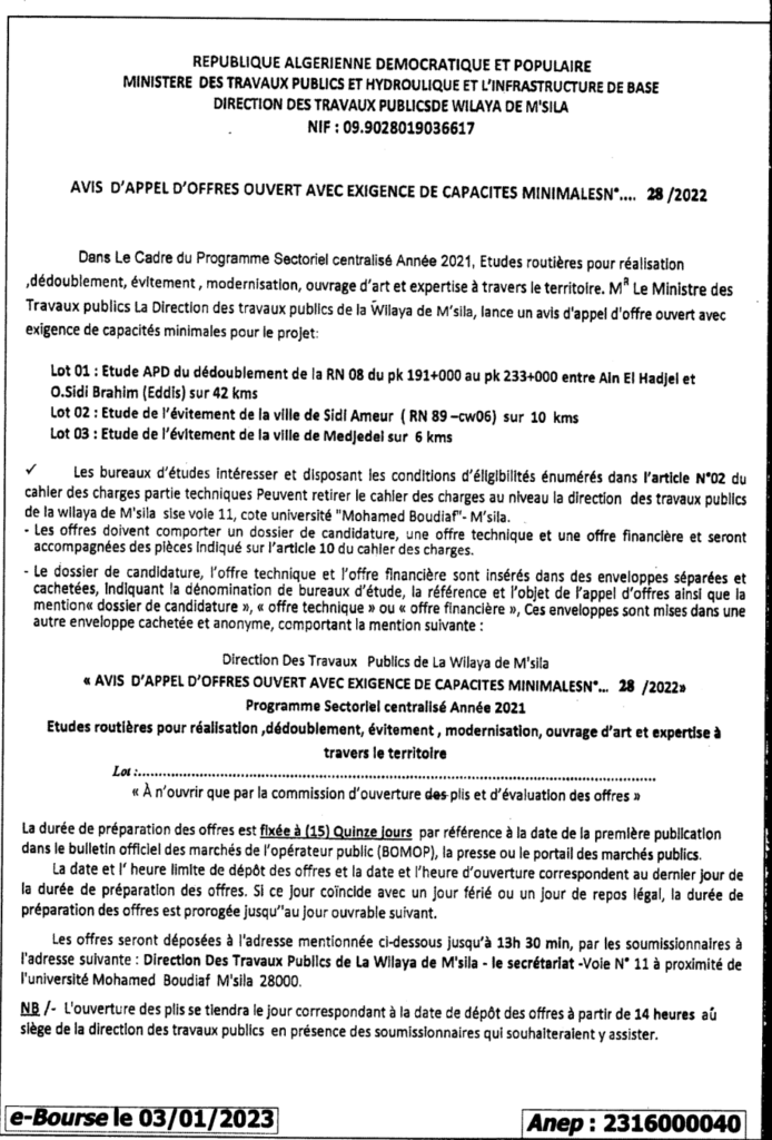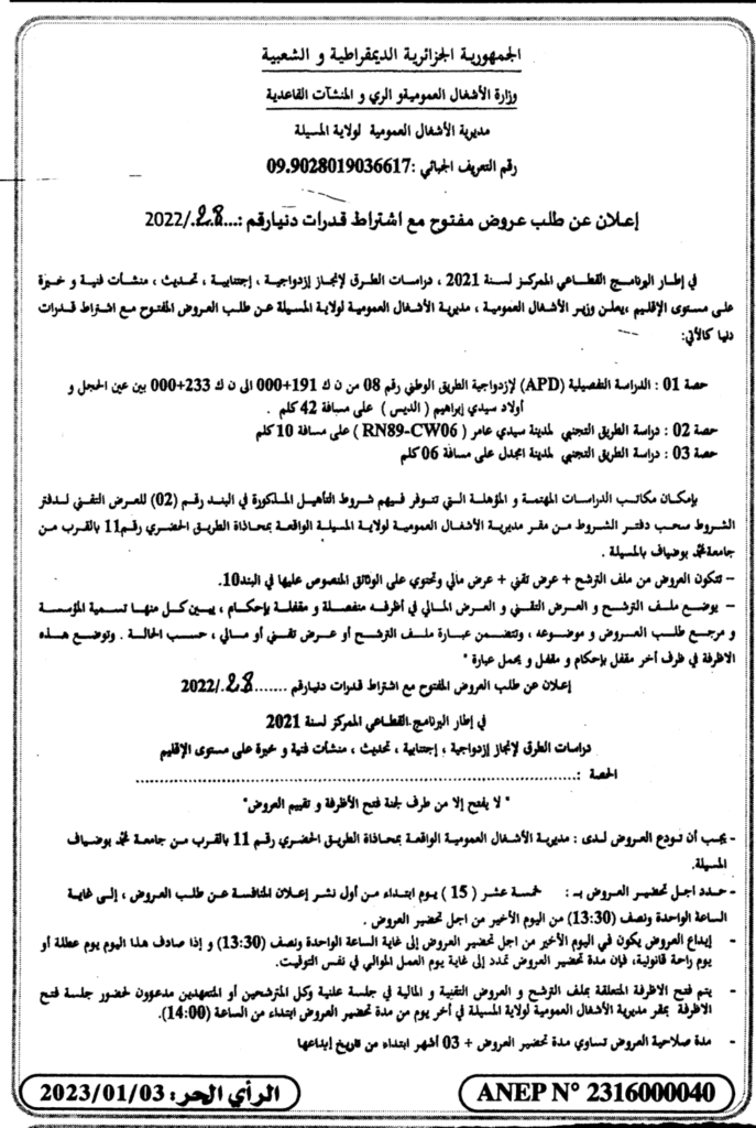 إعلان عن طلب عروض مفتوح 2022/28 مديرية الأشغال العمومية لولاية المسيلة