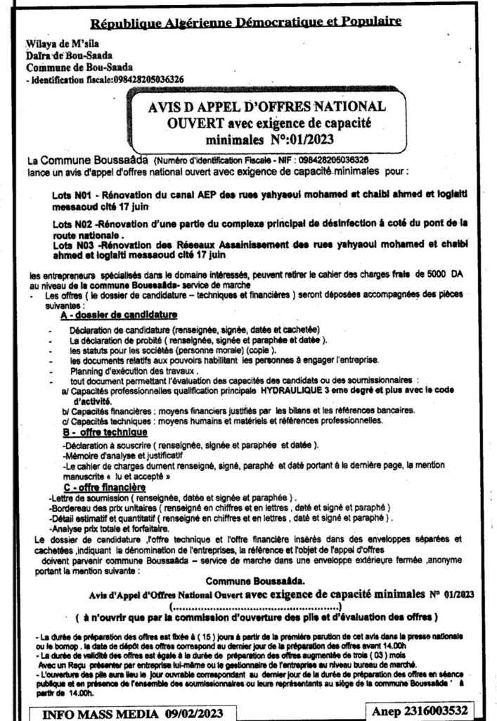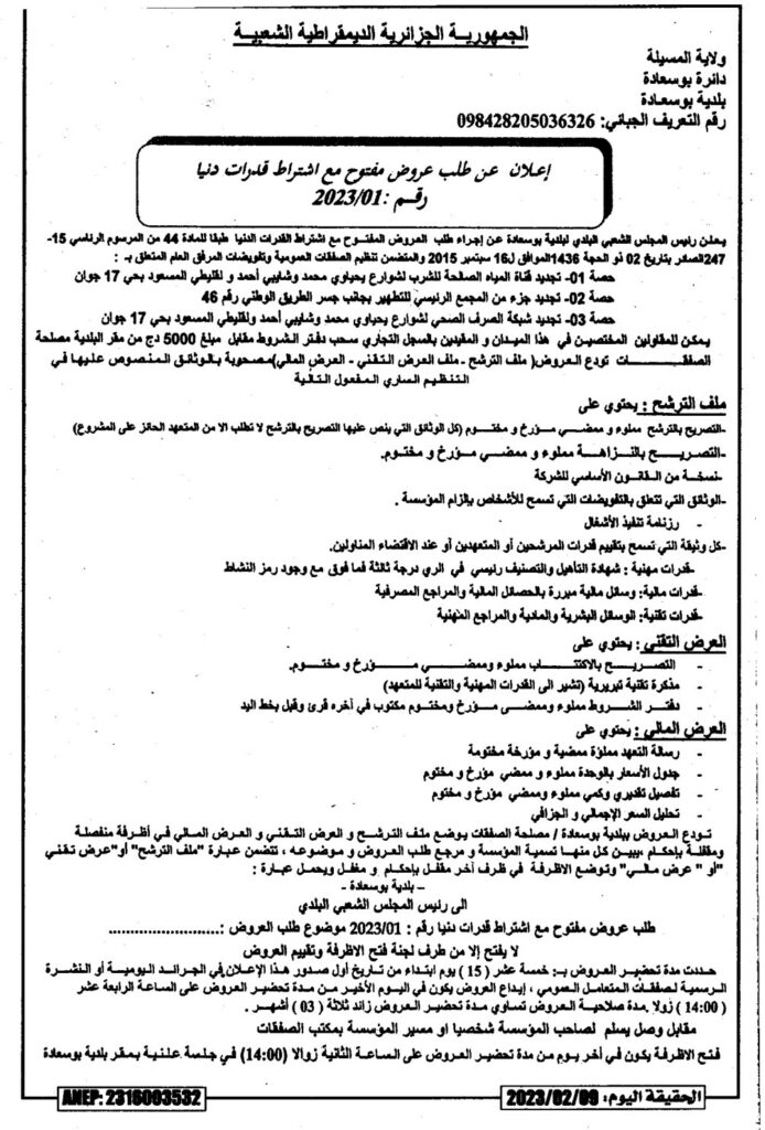 إعلان عن طلب عروض مفتوح 2023/01 بلدية بوسعادة