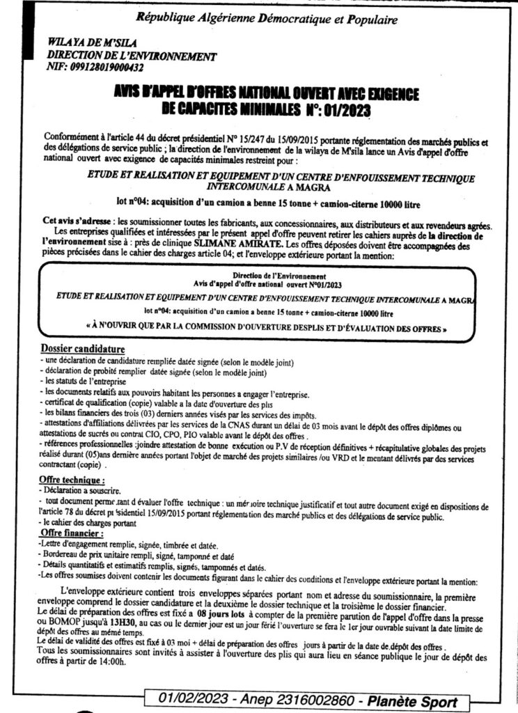 إعلان عن طلب عروض مفتوح 2023/01 مديرية التجهيزات العمومية لولاية المسيلة