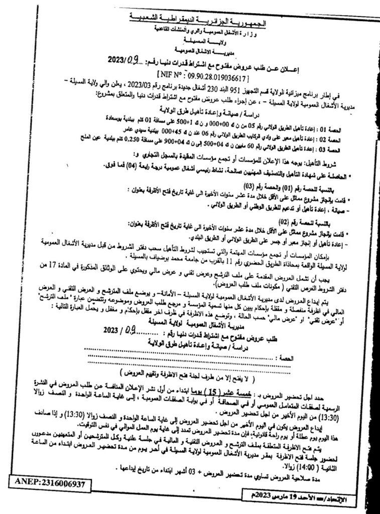 طلب عروض مفتوح مع اشتراط قدرات دنيا والمتعلق بمشروع: دراسة/ صيانة وإعادة تأهيل طرق الولاية19 مارس، 20230 70 شاركها فيسبوك X مشاركة عبر البريد طباعة