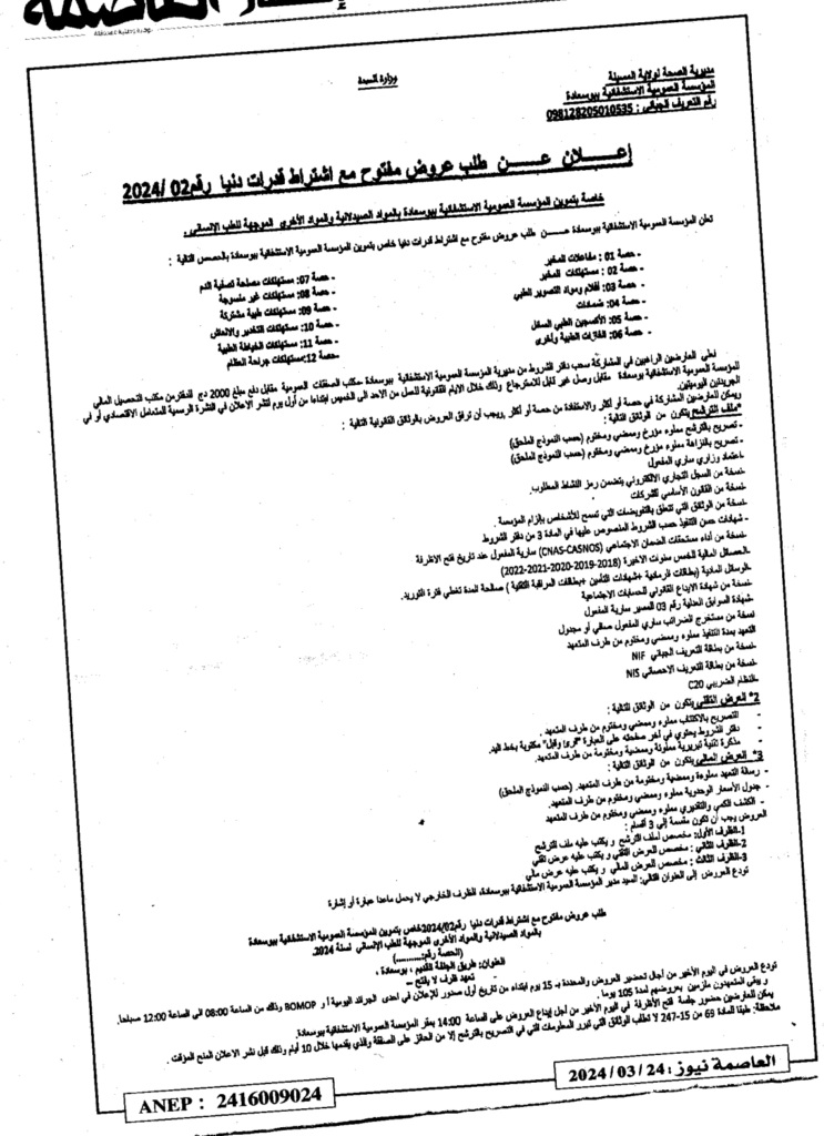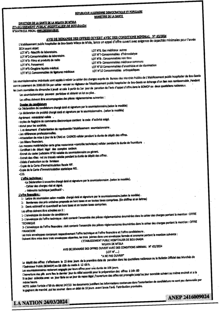إعلان عن طلب عروض مفتوح 2024/02 المؤسسة العمومية الاستشفائية بوسعادة