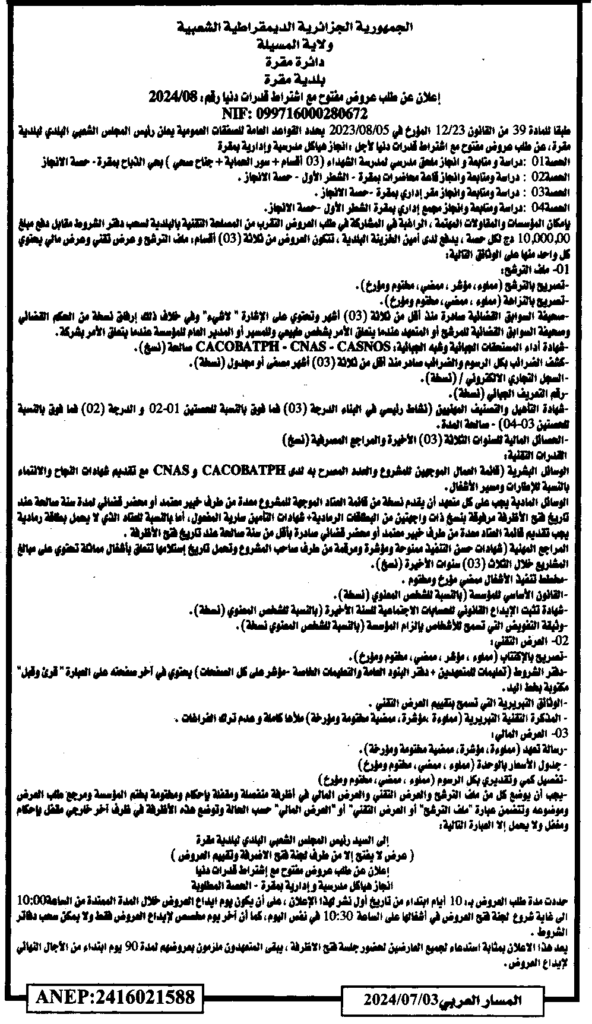 إعلان عن طلب عروض مفتوح 2024/08 بلدية مقرة