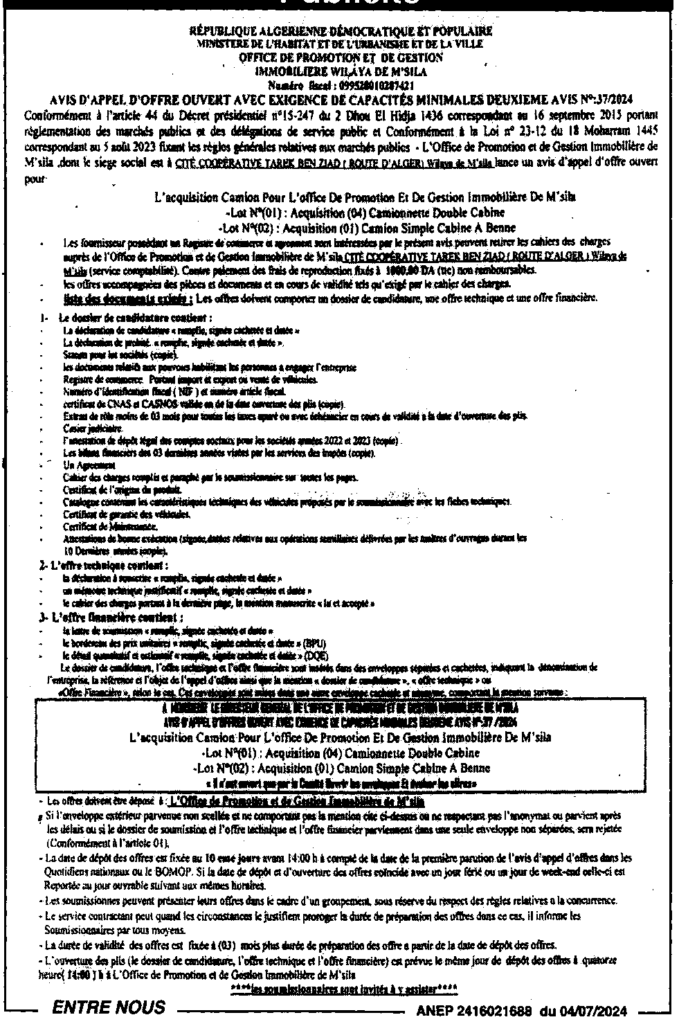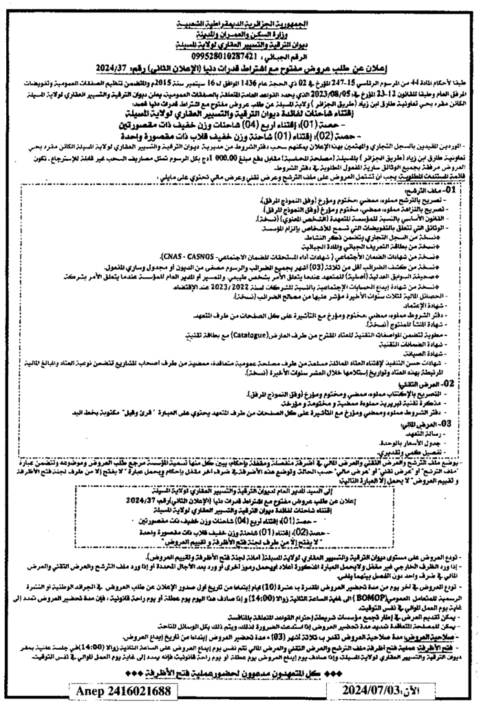 إعلان عن طلب عروض مفتوح 2024/37 (الاعلان الثاني)/ ديوان الترقية والتسيير العقاري لولاية المسيلة