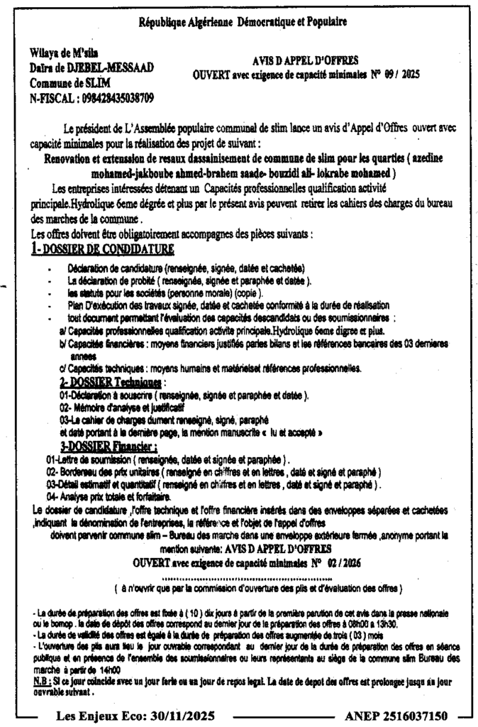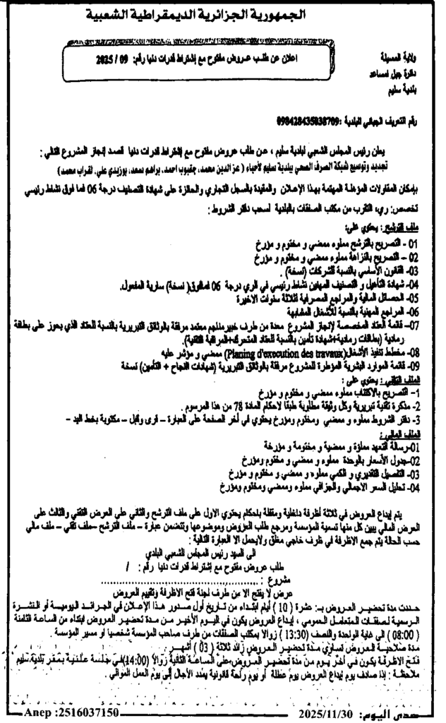 إعلان عن طلب عروض مفتوح 2025/09 بلدية سليم