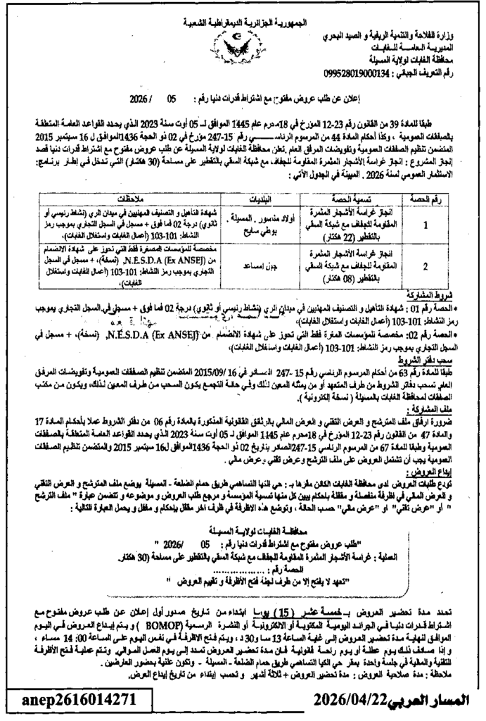إعلان عن طلب عروض مفتوح 2026/05 محافضة الغابات لولاية المسيلة