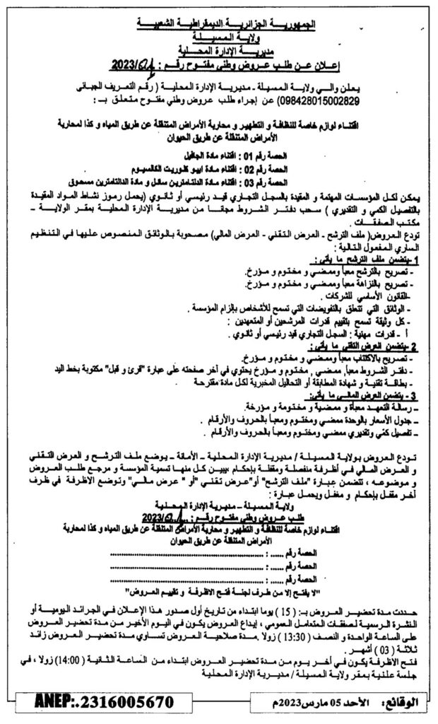 إعلان عن طلب عروض وطني مفتوح 2023/01 مديرية الادارة المحلية لولاية المسيلة