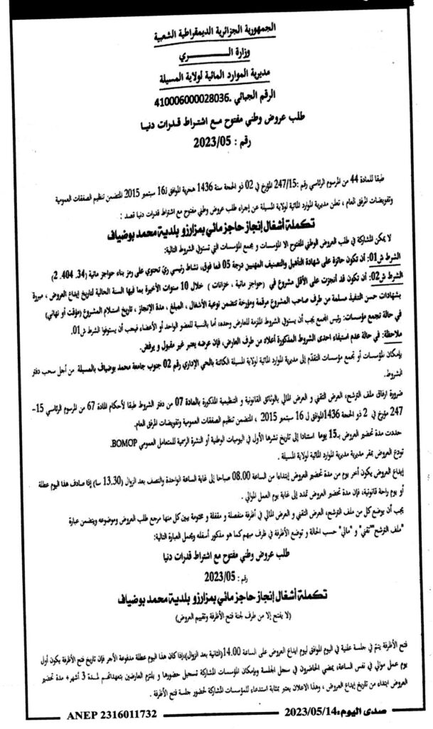 إعلان عن طلب عروض وطني مفتوح 2023/05: تكملة أشغال انجاز حاجز مائي بمزارزو بلدية محمد بوضياف/ مديرية الموارد المائية لولاية المسيلة
