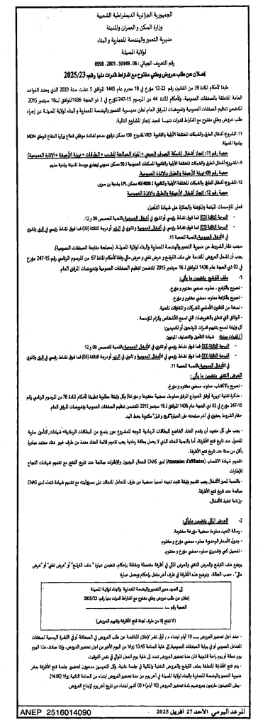 إعلان عن طلب عروض وطني مفتوح 2025/23 مديرية التعمير والهندسة المعمارية والبناء لولاية المسيلة