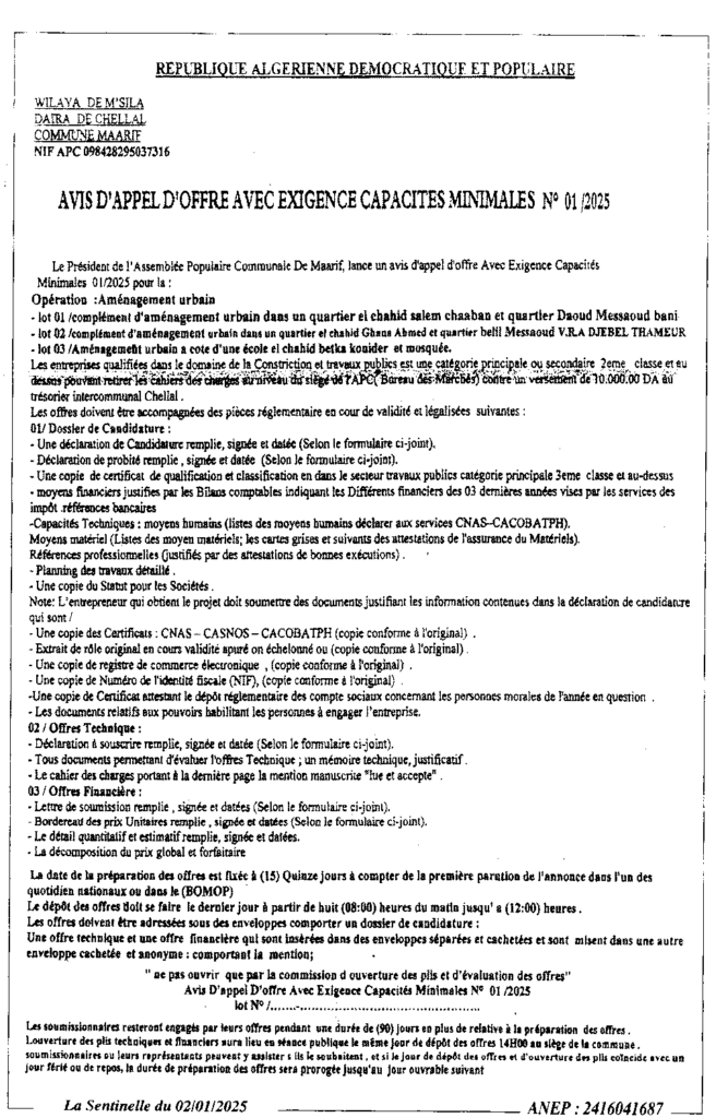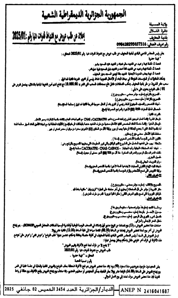 إعلان عن طلب عروض 2025/01 بلدية المعاريف