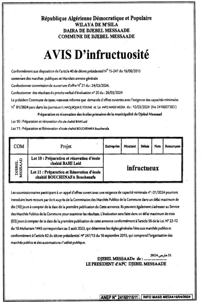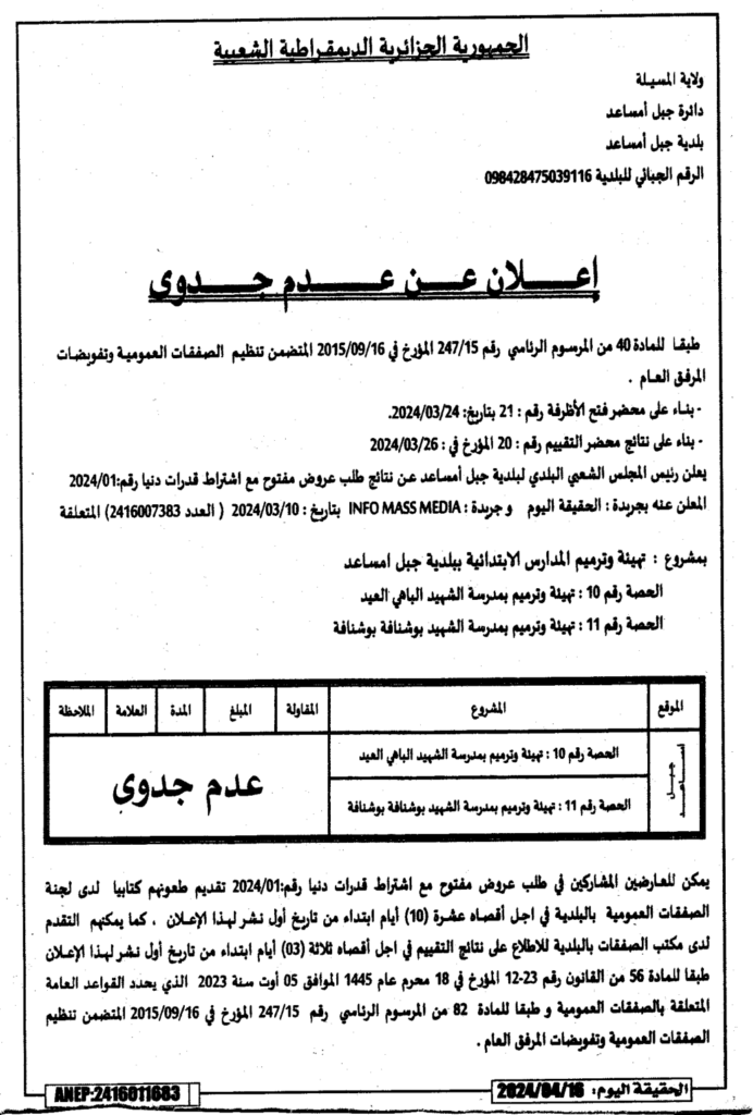إعلان عن عدم جدوى بمشروع تهيئة وترميم الامدارس الابتدائية بجبل امساعد
