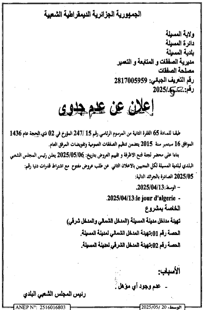 إعلان عن عدم جدوى تهيئة مداخل مدينة المسيلة/ بلدية المسيلة