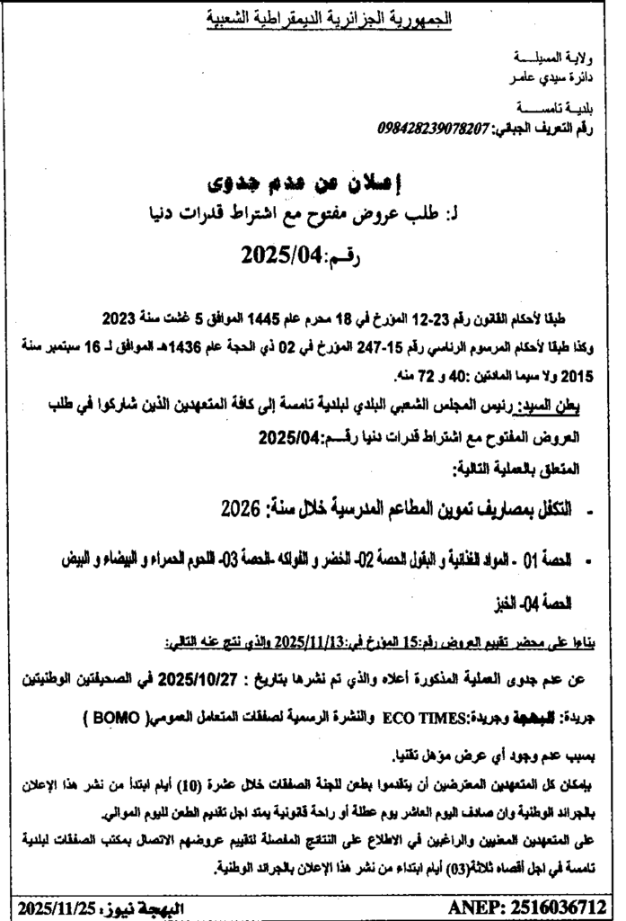إعلان عن عدم جدوى لطلب عروض مفتوح 2025/04 بلدية تامسة