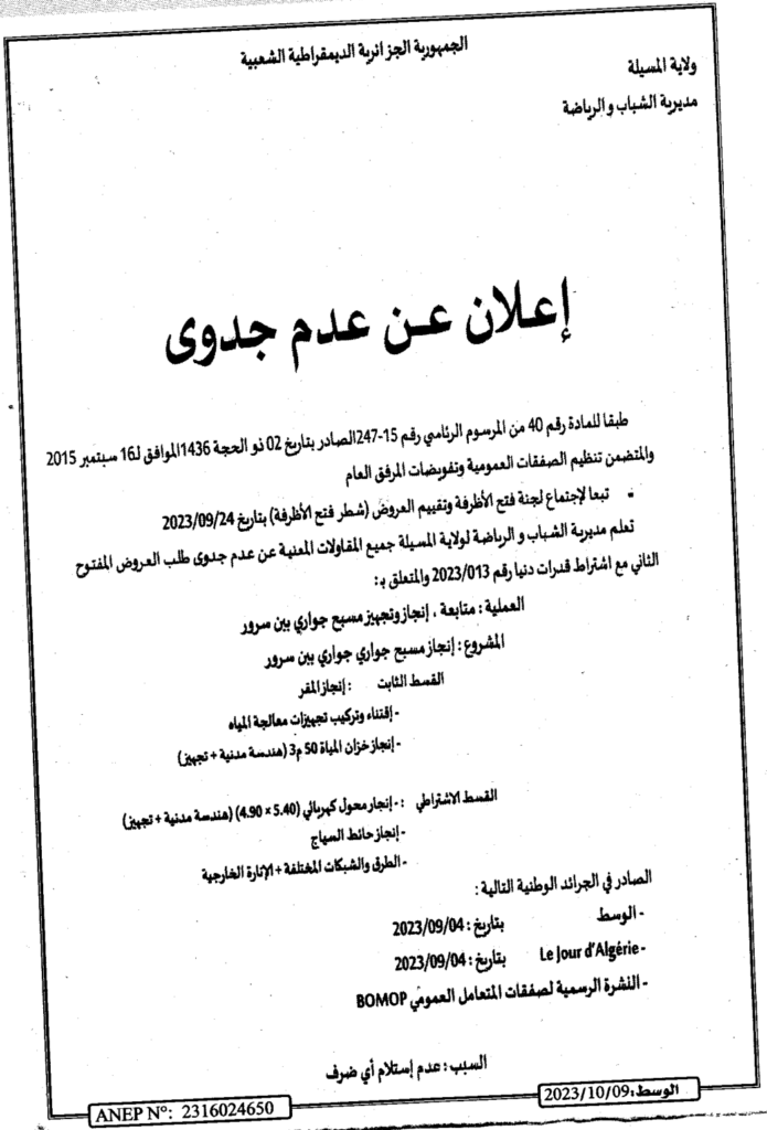 إعلان عن عدم جدوى/ مديرية الشباب والرياضة لولاية المسيلة