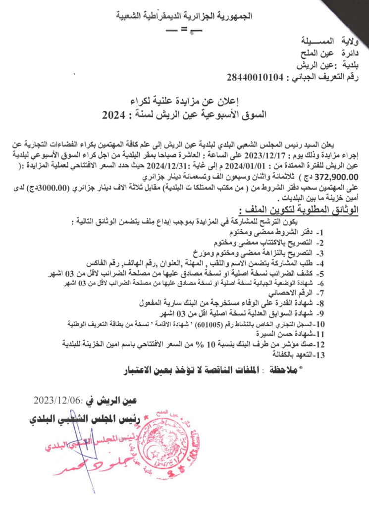 إعلان عن مزايدة علنية لكراء السوق الأسبوعية عين الريش لسنة 2024