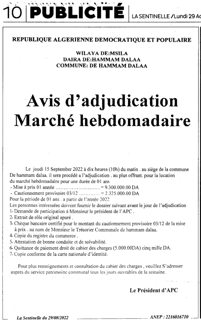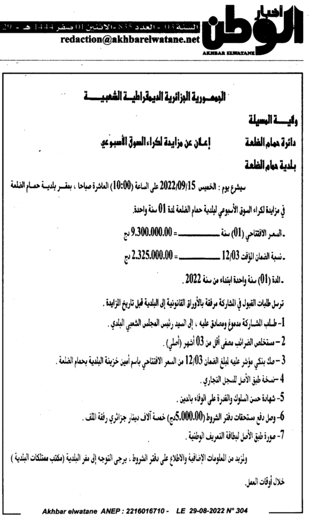 إعلان عن مزايدة لكراء السوق الأسبوعي بلدية حمام الضلعة