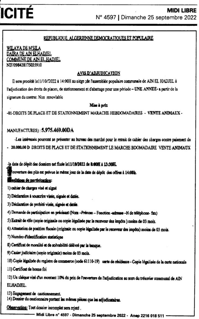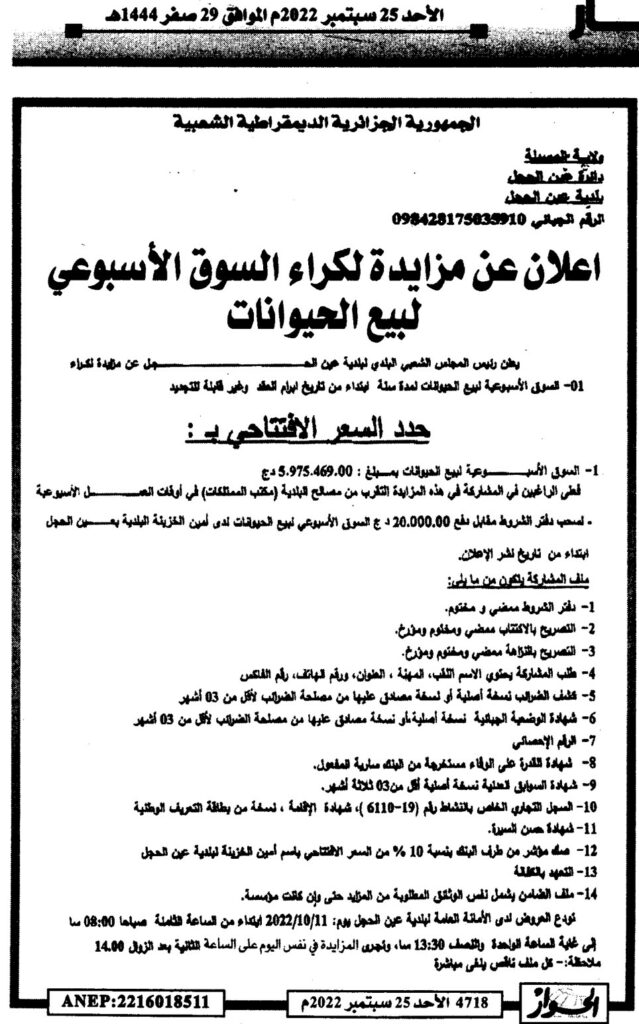 إعلان عن مزايدة لكراء السوق الأسبوعي لبيع الحيوانات بلدية عين الحجل