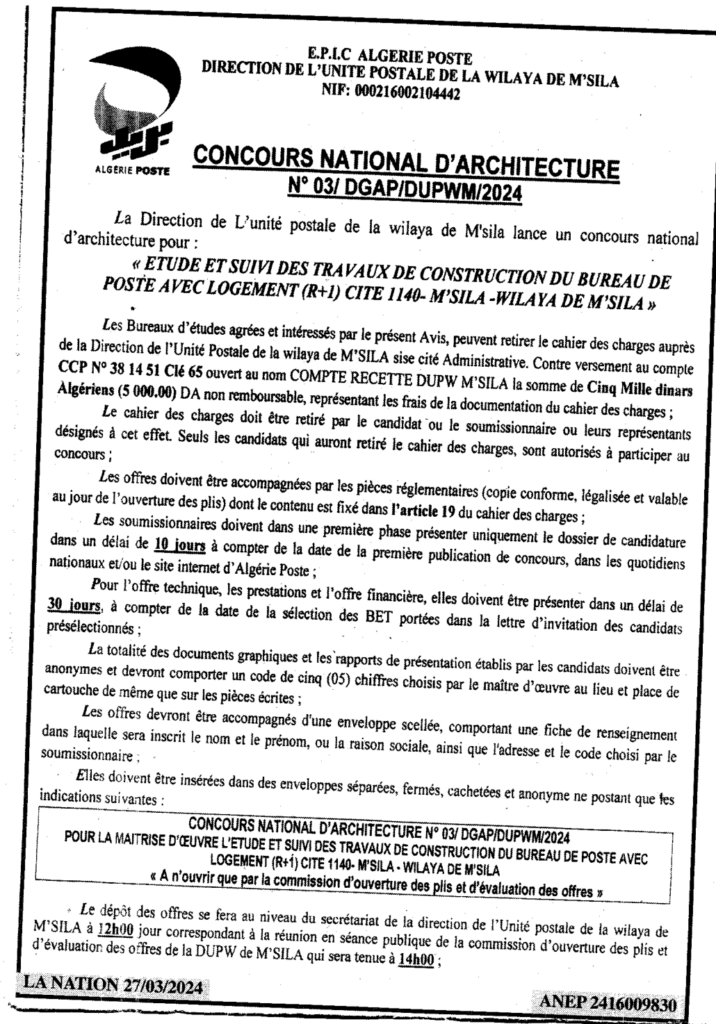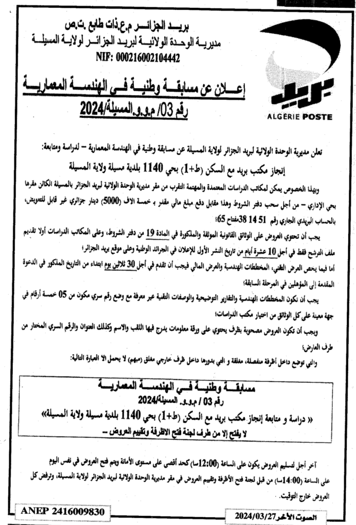 إعلان عن مسابقة وطنية في الهندسة المعمارية رقم 03/م.و.و.المسيلة/2024 مديرية الوحدة الولائية لبريد الجزائر لولاية المسيلة