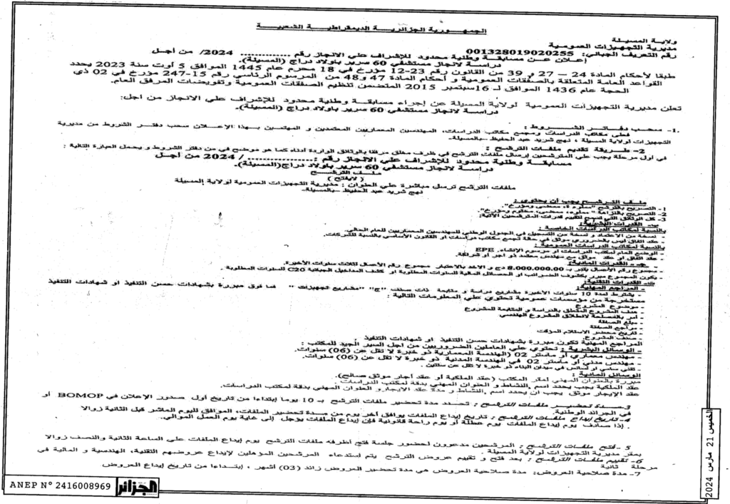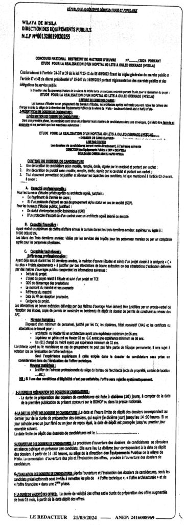 إعلان عن مسابقة وطنية محدودة للاشراف على: دراسة لانجاز مستشفى 60 سرير بأولاد دراج/ مديرية التجهيزات العمومية لولاية المسيلة