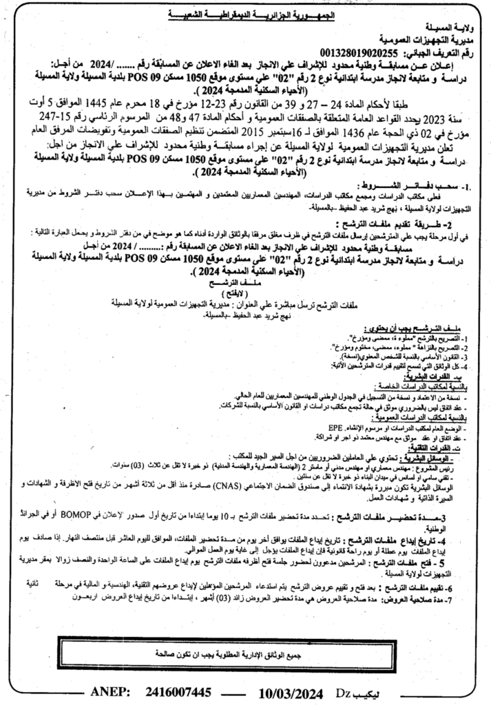 إعلان عن مسابقة وطنية محدود للاشراف على الانجاز بعد إلغاء الاعلان عن المسابقة من أجل دراسة ومتابعة لانجاز مدرسة ابتدائية نوع 2 رقم 02 على مستوى موقع 1050 مسكن 09 POS ببلدية المسيلة/ مديرية التجهيزات العمومية لولاية المسيلة