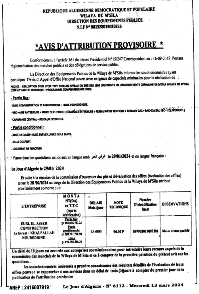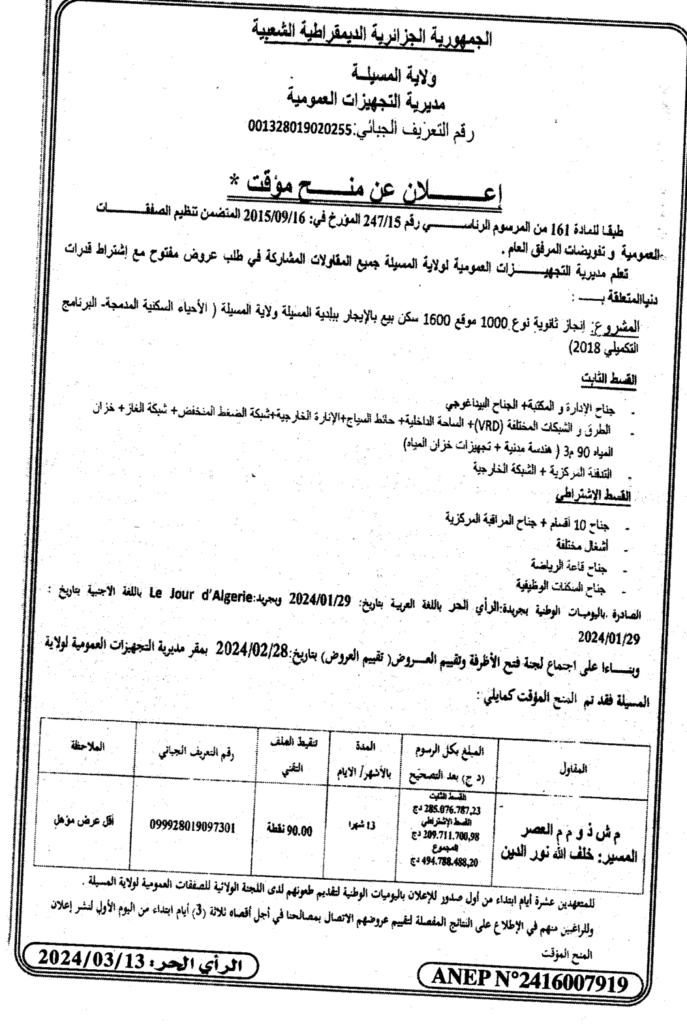 إعلان عن منح مؤقت: انجاز ثانوية نوع 1000 موقع 1600 مسكن بيع بالإيجار ببلدية المسيلة/ مديرية التجهيزات العمومية لولاية المسيلة