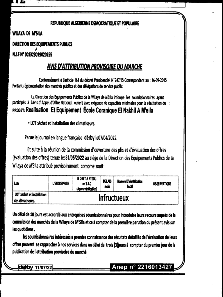 إعلان عن منح مؤقت: انجاز وتجهيز مدرسة قرآنية النخيل بالمسيلة مديرية التجهيزات العمومية
