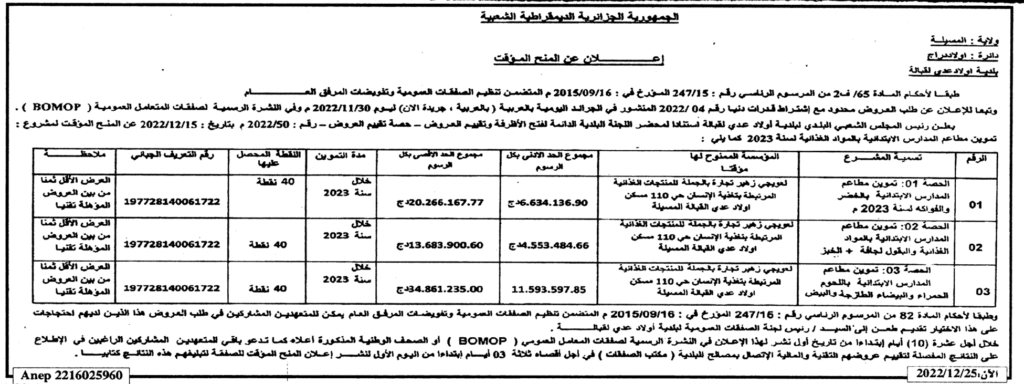إعلان عن منح مؤقت/ بلدية أولاد عدي لقبالة