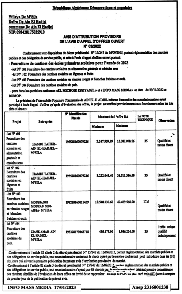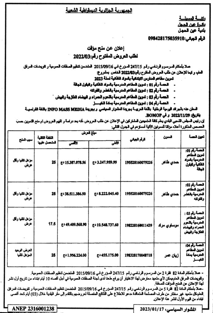 طلب عروض مفتوح الخاص بمشروع: تموين مطاعم المدارس الابتدائية بالمواد الغذائية لسنة 202317 يناير، 20230 24 شاركها فيسبوك X مشاركة عبر البريد طباعة