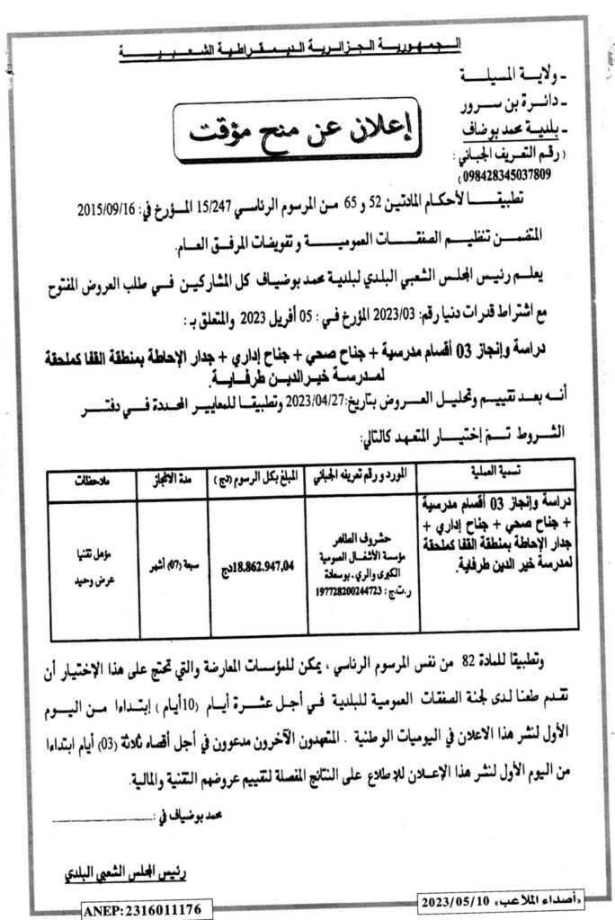 إعلان عن منح مؤقت: دراسة وانجاز 03 أقسام مدرسية + جناح صحي + جناح غداري + جدار الإحاطة بمنطقة القفا كملحقة لمدرسة خير الدين طرفاية بلدية محمد بوضياف