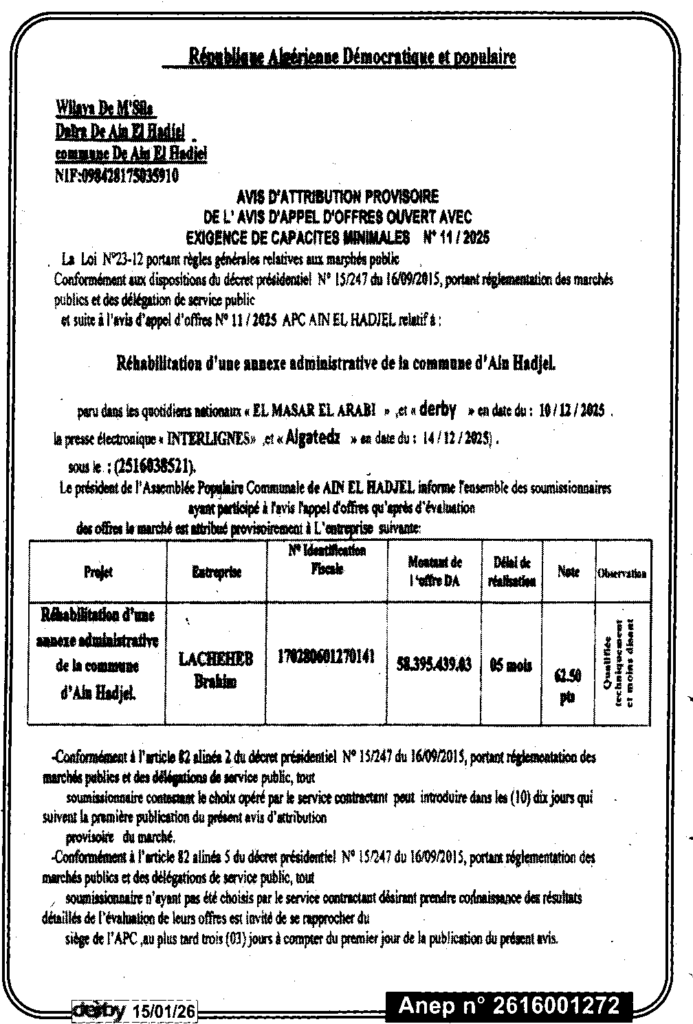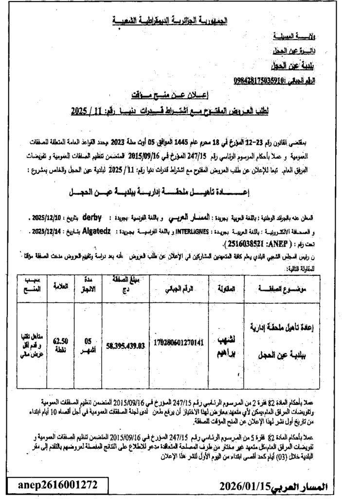 إعلان عن منح مؤقت لطلب العروض المفتوح 2025/11 بلدية عين الحجل