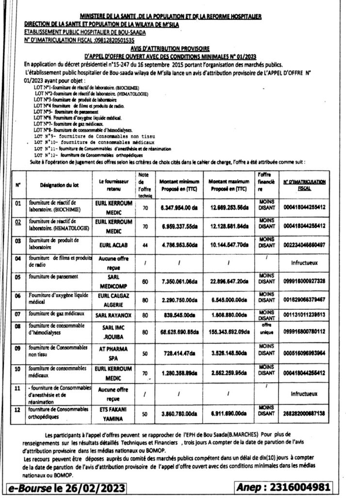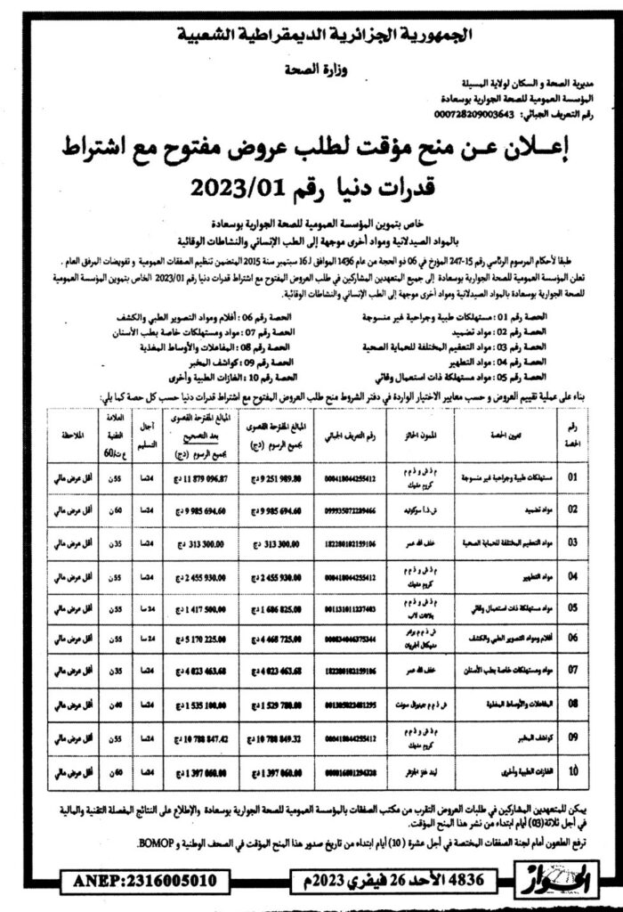 إعلان عن منح مؤقت لطلب عروض مفتوح 2023/01 خاص بتموين المؤسسة العمومية للصحة الجوارية بوسعادة بالمواد الصيدلانية ومواد أخرى موجهة للطب الانساني والنشاطات الوقائية