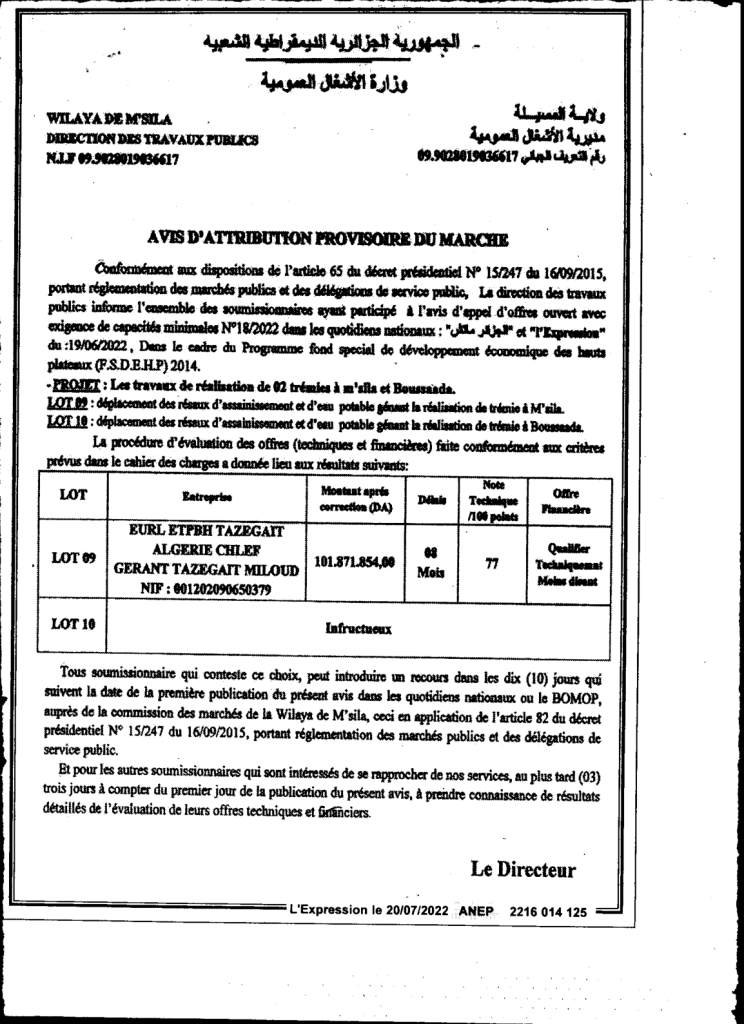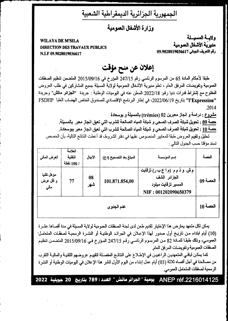 إعلان عن منح مؤقت لمشروع دراسة وانجاز معبرين 02 (trémies) بالمسيلة وبوسعادة مديرية الأشغال العمومية
