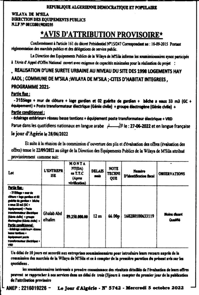 إعلان عن منح مؤقت مديرية التجهيزات العمومية