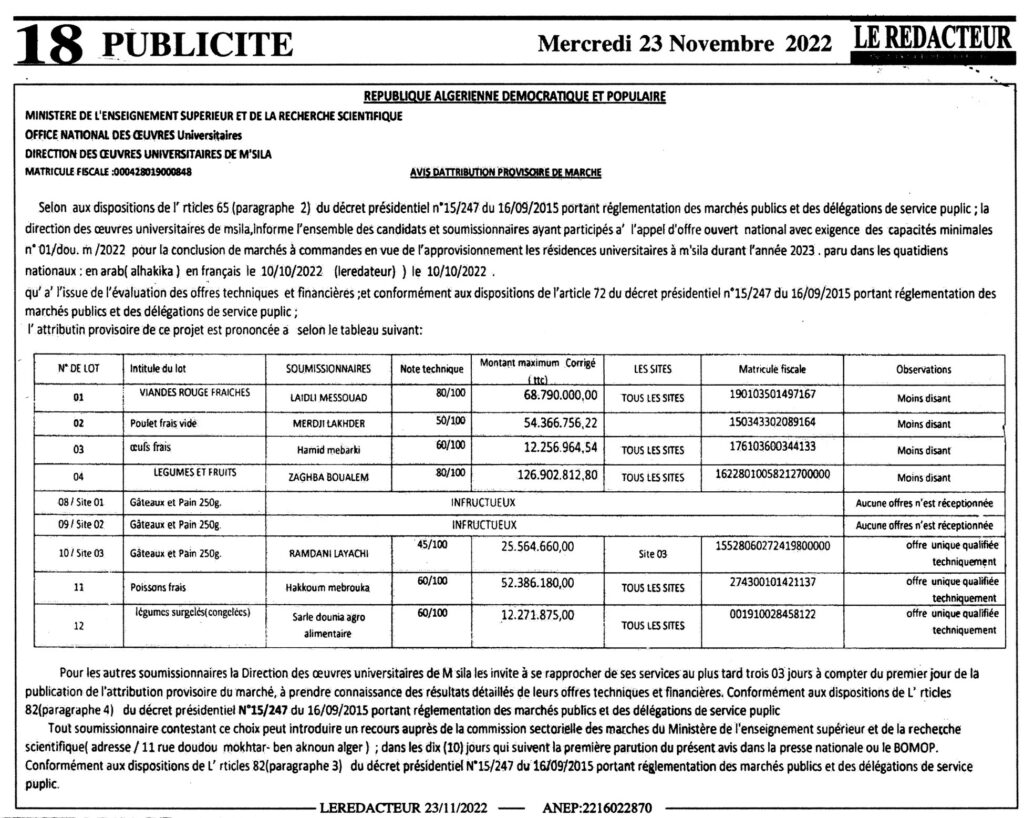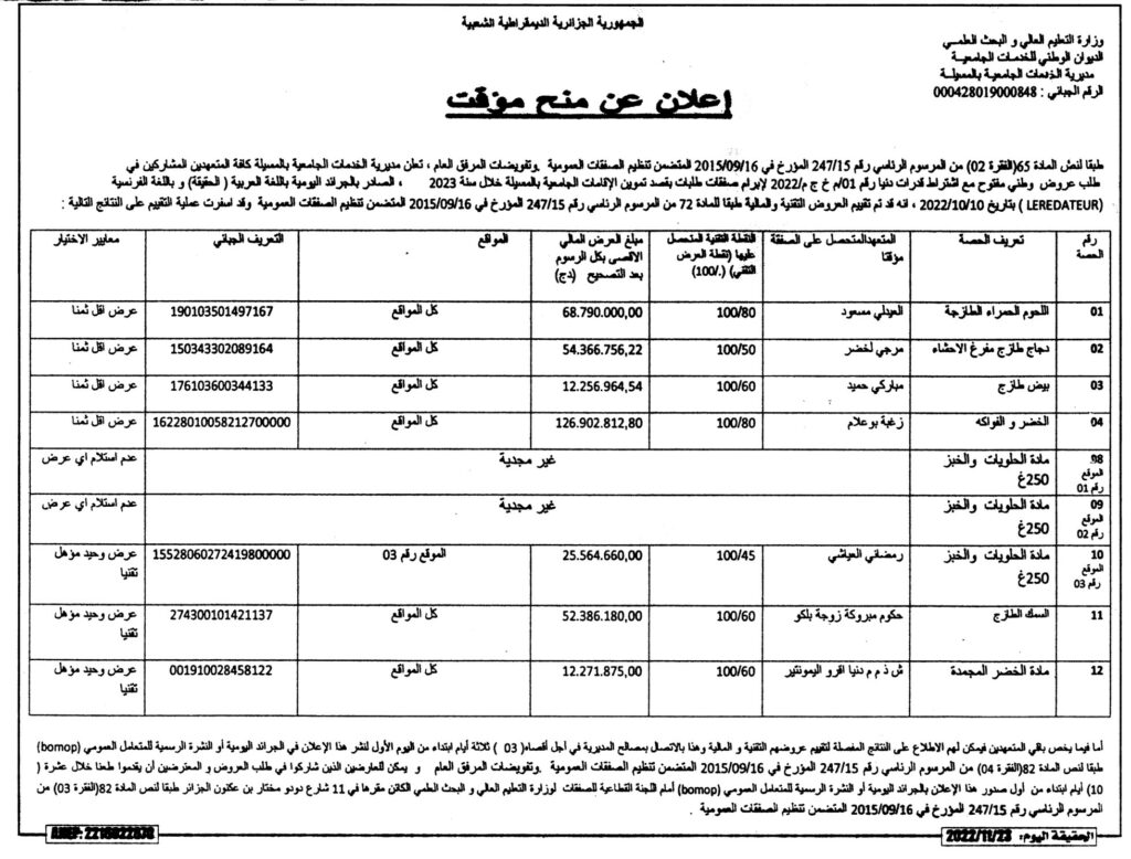 طلب عروض وطني مفتوح مع اشتراط قدرات دنيا طلبات لإبرام صفقة طلبات بقصد تموين الإقامات الجامعية بالمسيلة خلال سنة 2023.23 نوفمبر، 20220 24 شاركها فيسبوك X مشاركة عبر البريد طباعة