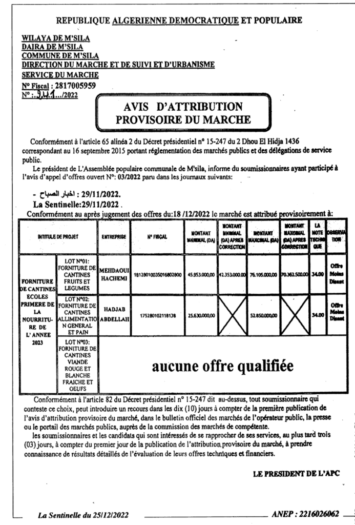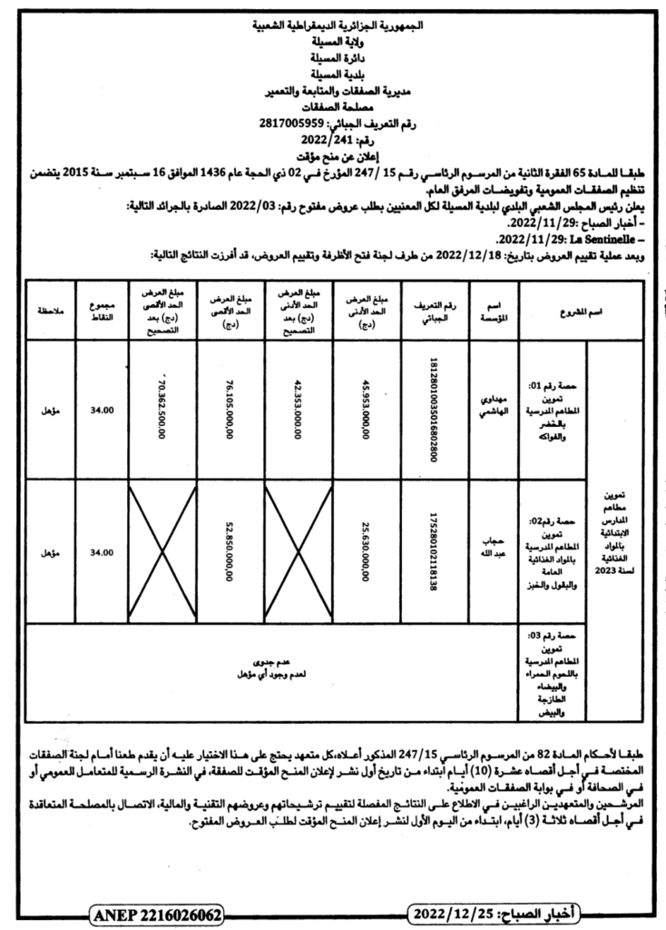 إعلان عن منح مؤقت/ مديرية الصفقات والمتابعة والتعمير بلدية المسيلة