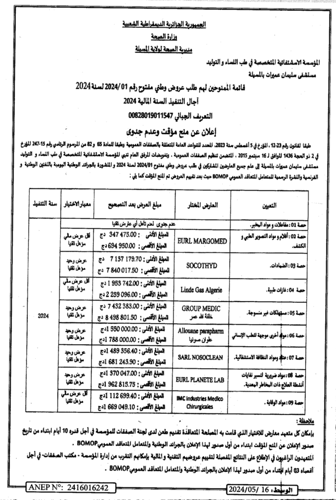إعلان عن منح مؤقت وعدم جدوى: قائمة الممنوحين لهم طلب عروض وطني مفتوح 2024/01 مستشفى سليمان عميرات بالمسيلة