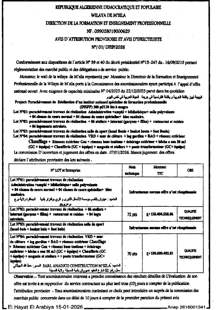 إعلان عن منح مؤقت وعدم جدوى 2026/01 مديرية التكوين والتعليم المهنيين