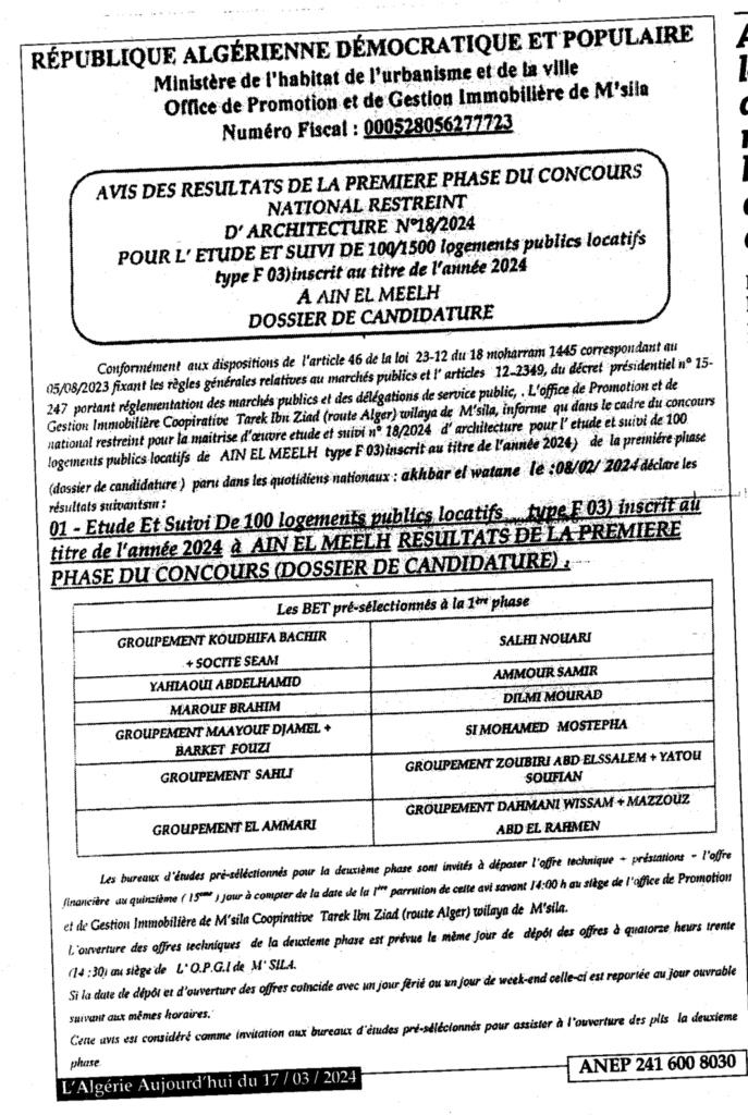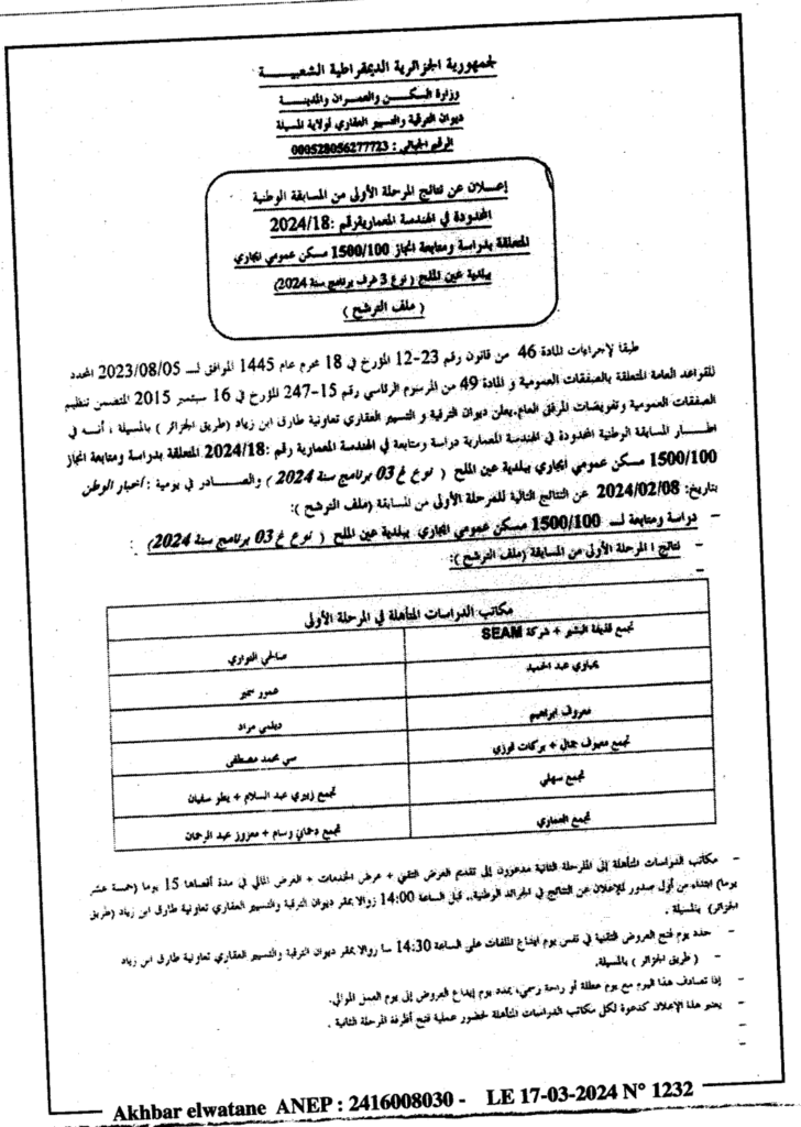 إعلان عن نتائج المرحلة الأولى من المسابقة الوطنية المحدودة في الهندسة المعمارية 2024/18 المتعلقة بدراسة ومتابعة انجاز 1500/100 مسكن عمومي ببلدية عين الملح/ ديوان الترقية والتسيير العقاري لولاية المسيلة
