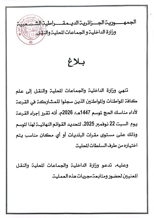بلاغ بخصوص موعد إجراء القرعة لأداء مناسك الحج لموسم 1447هــ / 2026 م