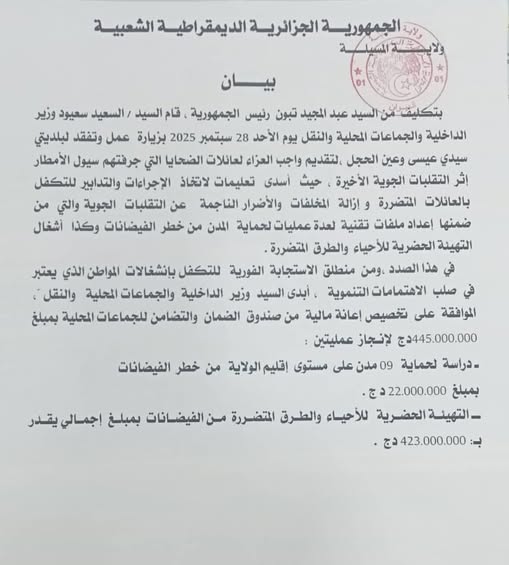 بيان بخصوص الاجراءات والتدابير للتكفل بالعائلات المتضررة اثر التقلبات الجوية الأخيرة